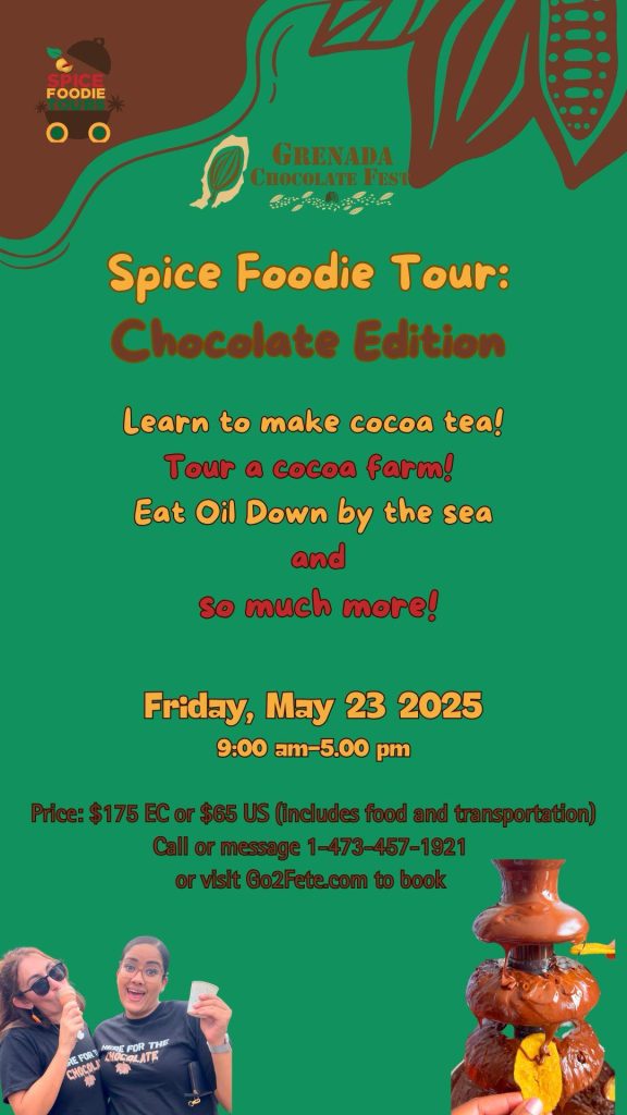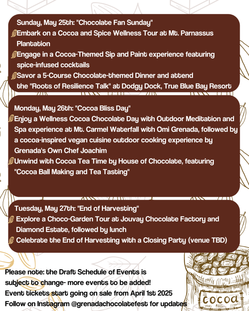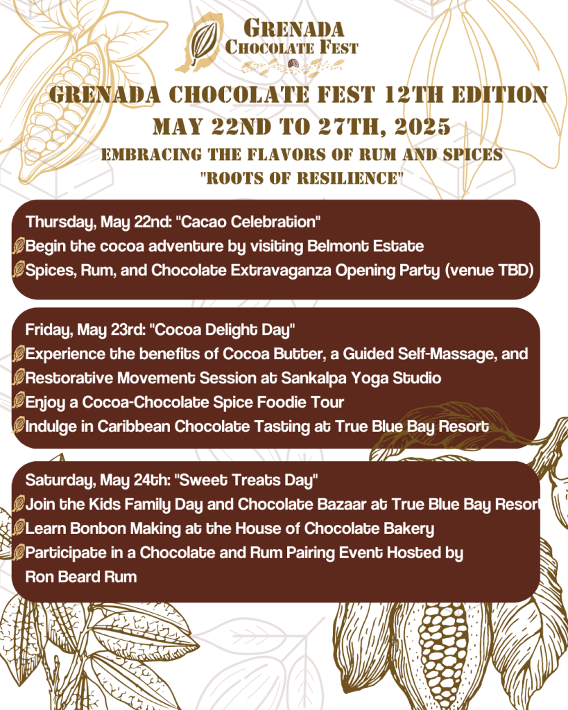 Del 22 al 27 de mayo de 2025, Granada volverá a ser sede del Grenada Chocolate Fest que desde el 2014, celebra todo lo relacionado con el cacao, desde el proceso de elaboración del chocolate del árbol a la tableta hasta los productos locales y sostenibles inspirados en el cacao.