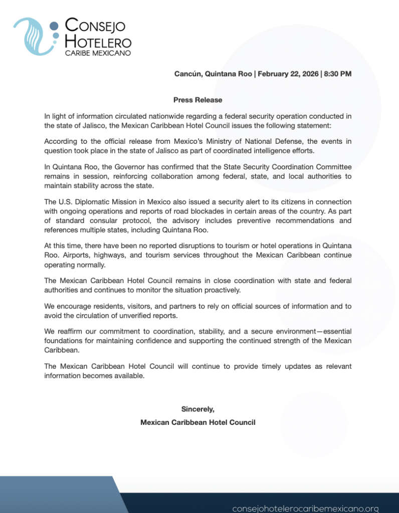 Asi lo expuso en un boletín de prensa el Consejo Hotelero del Caribe Mexicano, en el que especificaron que conforme a la información oficial disponible hasta este momento, no se cuenta con reportes de afectaciones a la operación turística y hotelera en Quintana Roo.