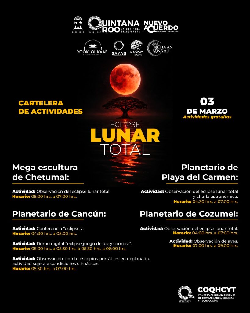 Los planetarios del Caribe Mexicano ya están listos para presenciar el eclipse lunar total que tendrá lugar el 3 de marzo e hicieron una invitación para asistir a los eventos que por tal motivo se llevarán a cabo en las distintas sede del Consejo Quintanarroense de Humanidades, Ciencias y Tecnologías (COQHCYT).