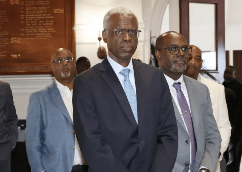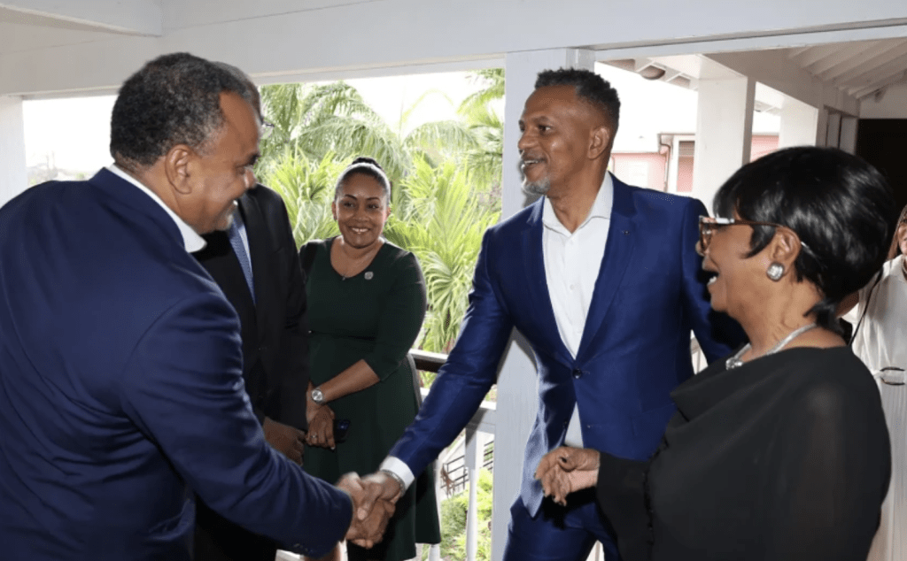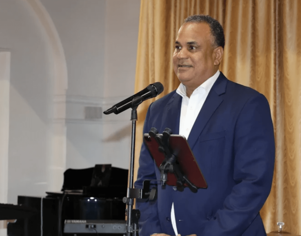 El ministro de Asuntos Económicos, Michael Halkitis, dio las palabras de bienvenida durante la recepción del Banco de Desarrollo del Caribe (BDC) en el Salón de Baile de la Casa de Gobierno.