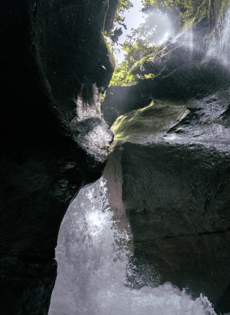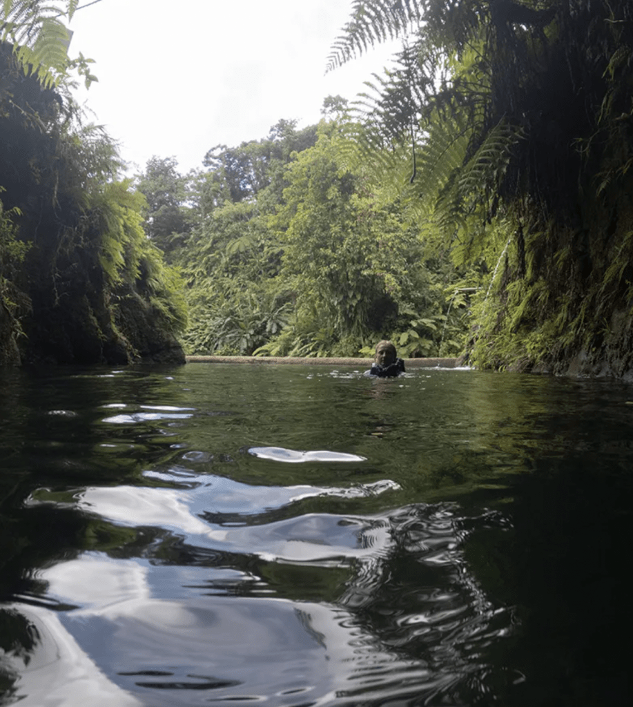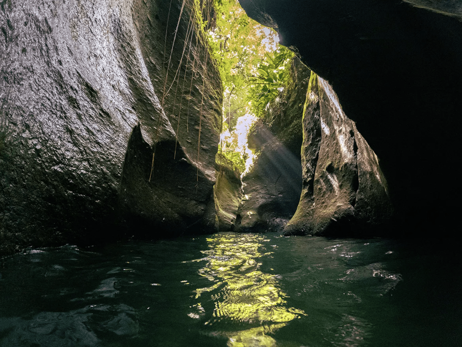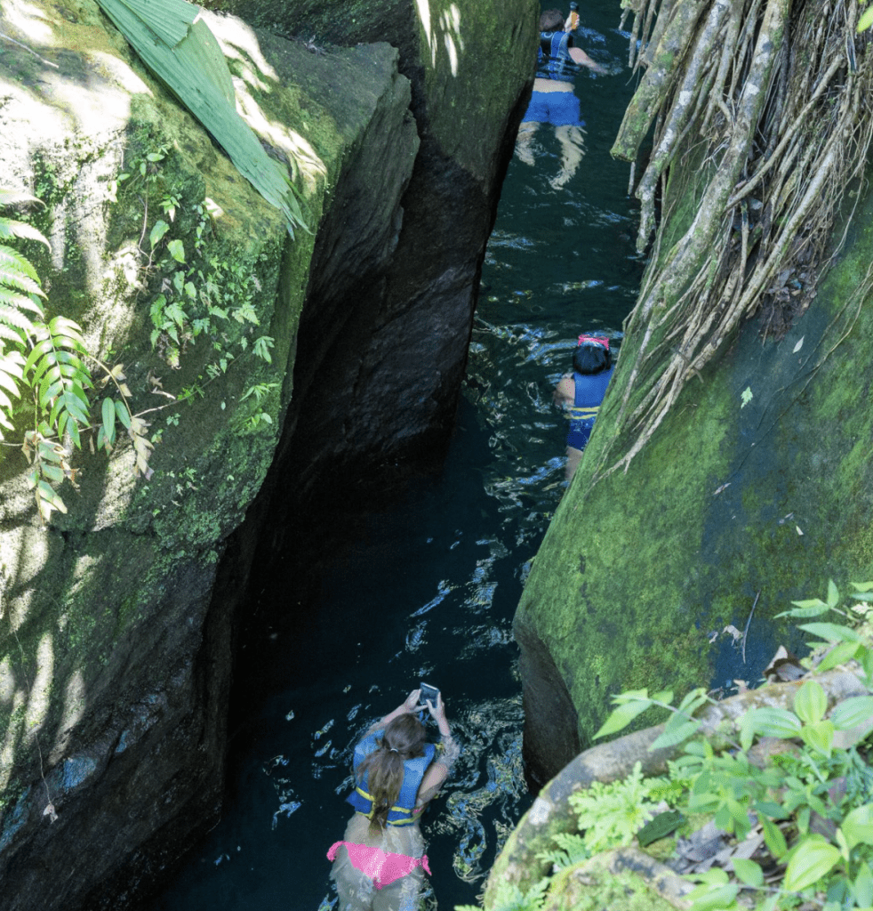 Dentro de la cueva, el sol dorado penetra casi como un foco, iluminando a los bañistas en este mágico paisaje que al ir nadando por el cañón, revela un oasis tranquilo y esmeralda, arrullado por el canto de los pájaros y el susurro de los árboles.