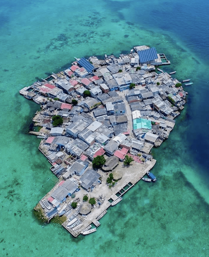 Situado entre las islas de Tintipán y Múcura, adonde se llega tras un viaje de 45 minutos en lancha desde el municipio de Tolú, en el Caribe colombiano, al islote de Santa Cruz se le atribuye ser la isla artificial más densamente poblada del mundo.