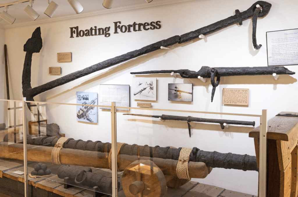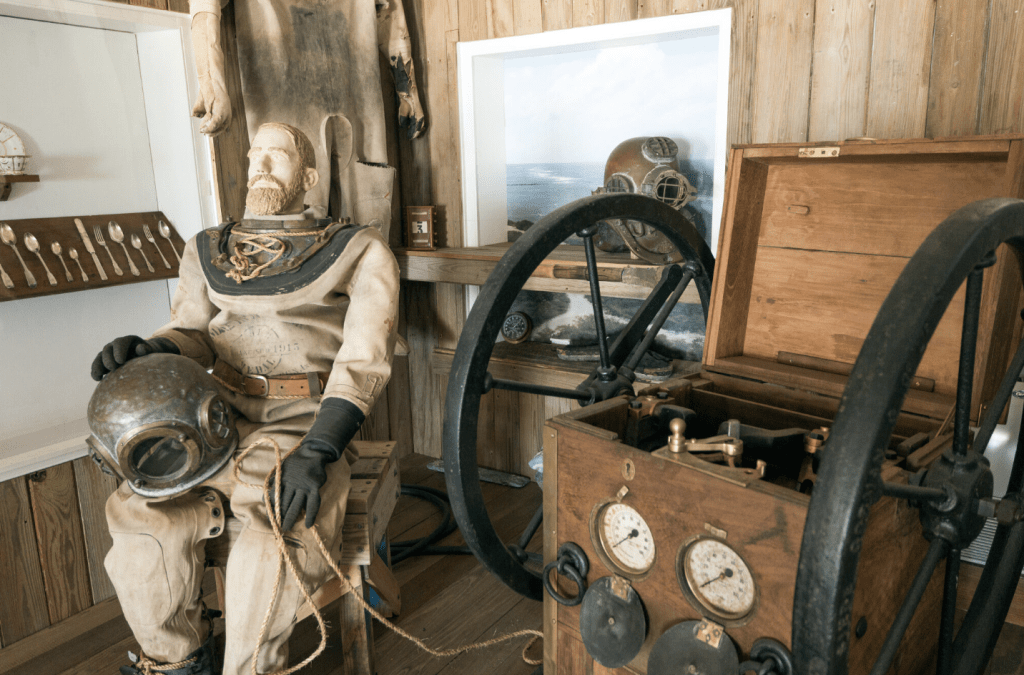 Entre los artefactos se incluyen monedas españolas del siglo 17, sellos postales antiguos, banderas históricas, equipo primitivo de buceo y rescate de naufragios, y mucho más.