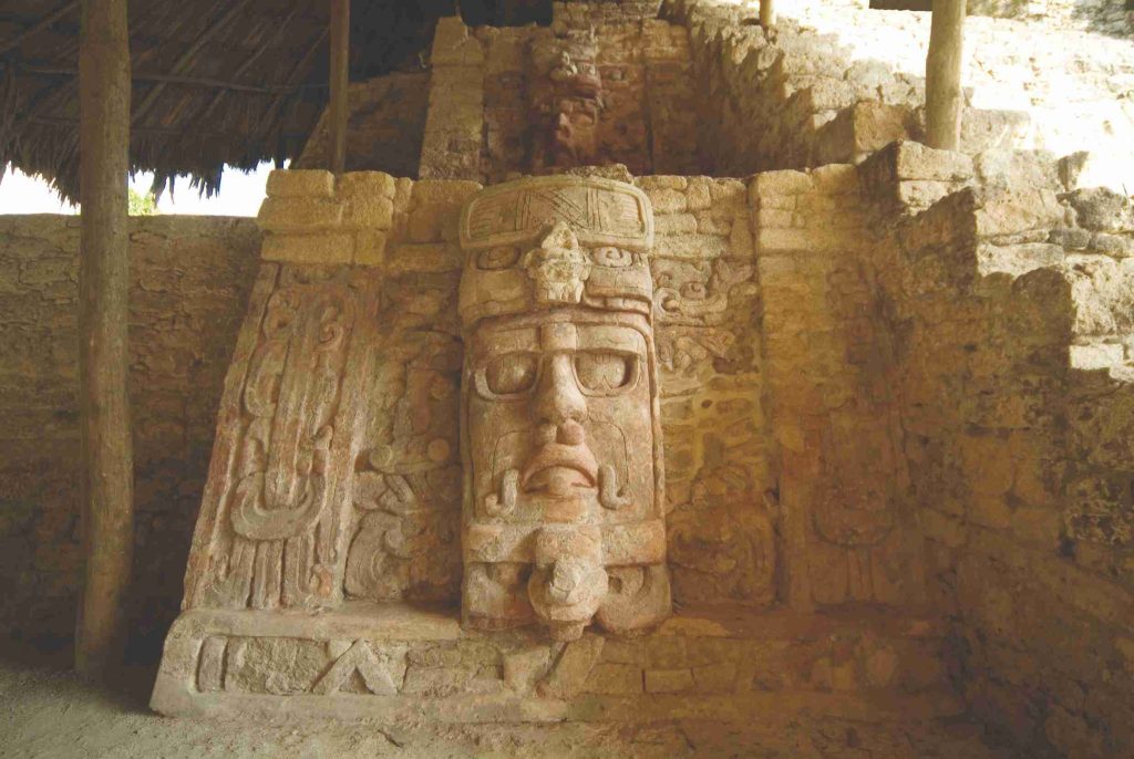 Los rostros están ataviados con orejeras y tocados, que se creen representan la vinculación de los gobernantes con el dios maya solar, Kinich Ahau.